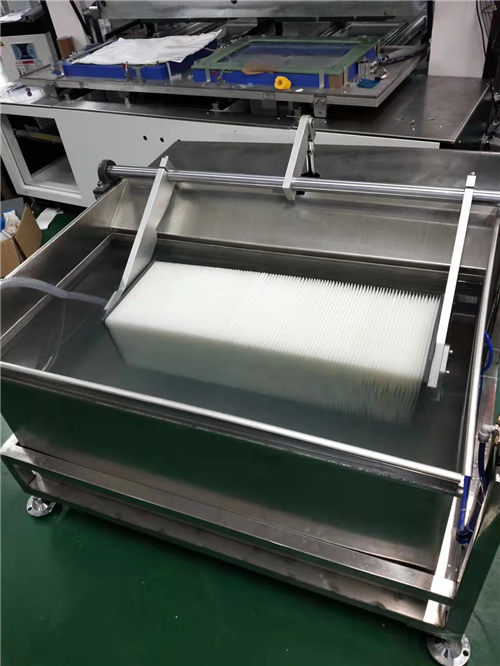 軟式膜全自動焊接設(shè)備通過熱導(dǎo)焊的焊接方式實現(xiàn)對膜片的焊接,其包括加熱部、導(dǎo)熱部和散熱部,導(dǎo)熱部設(shè)置于待焊接的膜片上方,導(dǎo)熱部在加熱部的作用下發(fā)熱,完成焊接。 軟式膜全自動焊接設(shè)備包括機架,還包括設(shè)置于機架上并依次連接的送料單元、焊接單元、裁切單元、出料單元和檢料單元。 并為其配套膜檢測設(shè)備(人工將產(chǎn)品水平放入掛鉤內(nèi),接通氣源,撥動電磁閥氣缸將產(chǎn)品浸入水中,當膜片完全浸入水中后將電磁閥撥到中間位置,通氣檢測,手動翻轉(zhuǎn)膜片,通過氣泡密集度判定膜片焊接強度,檢測完氣缸將產(chǎn)品拉起瀝水)。膜通量檢測設(shè)備(產(chǎn)品固定好放入水箱,打開蠕動泵開始通水測試,滲透的水流入量杯,時間達到后測量量杯里的水記錄下數(shù)據(jù))。膜測拉力設(shè)備(將測試產(chǎn)品夾持住,按自動鍵,按升進行測試記錄產(chǎn)品拉力)。