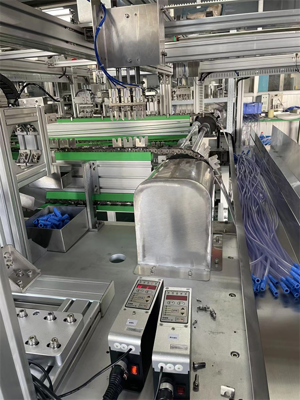 用于1.7-1.5米連接管的自動涂膠、粘接頭設(shè)備。設(shè)備直接對接擠出機(jī),機(jī)械手自動抓取管子,移放至輸送線自動涂膠,粘管頭。并對裝好的管頭進(jìn)行檢測,排除不良。