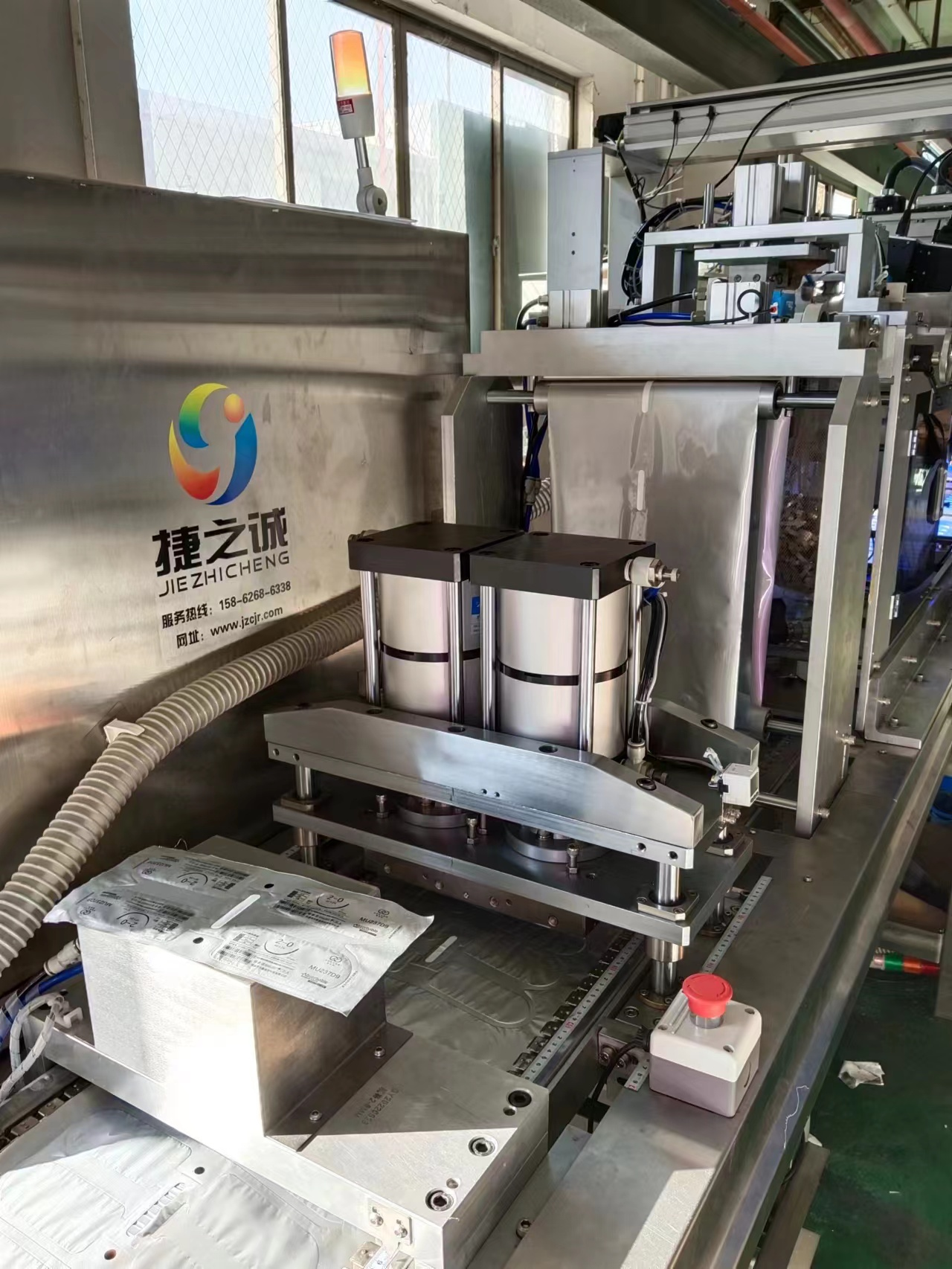 設(shè)備用于可吸收性外科縫線塑料盤的包裝生產(chǎn),包括穴位成型、自動(dòng)放料、在線監(jiān)測(cè)、透析紙熱合、熱合封裝、自動(dòng)裁切、廢料收集等功能。